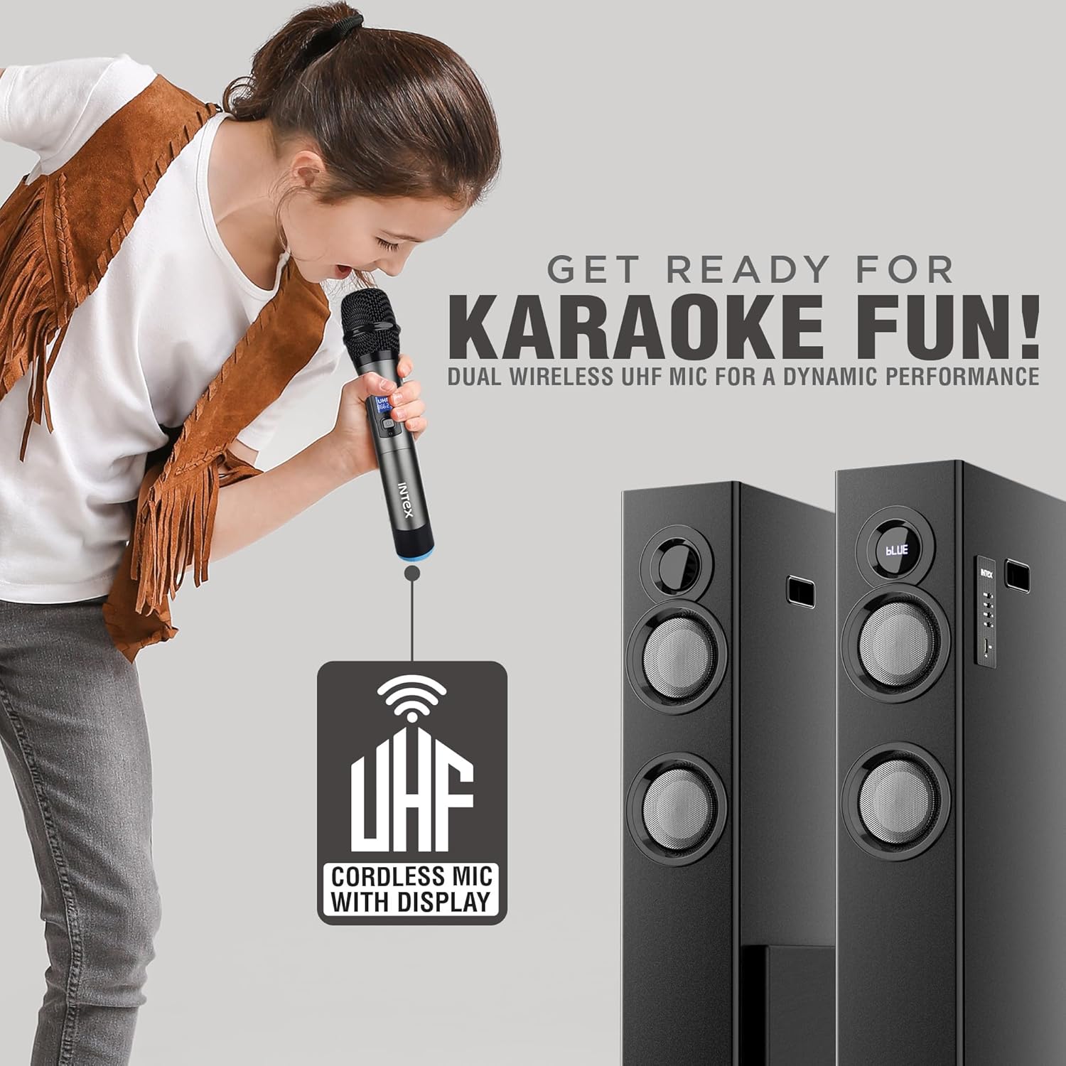 Includes two cordless karaoke microphones, ideal for duets, parties, events, or personal enjoyment.